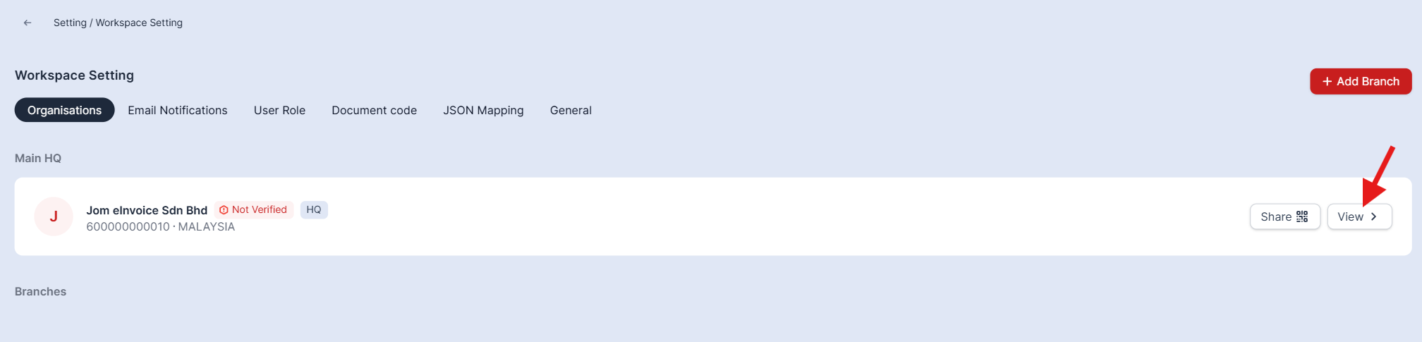 Step 1: To verify your JomeInvoice Workspace account, go to Settings > View