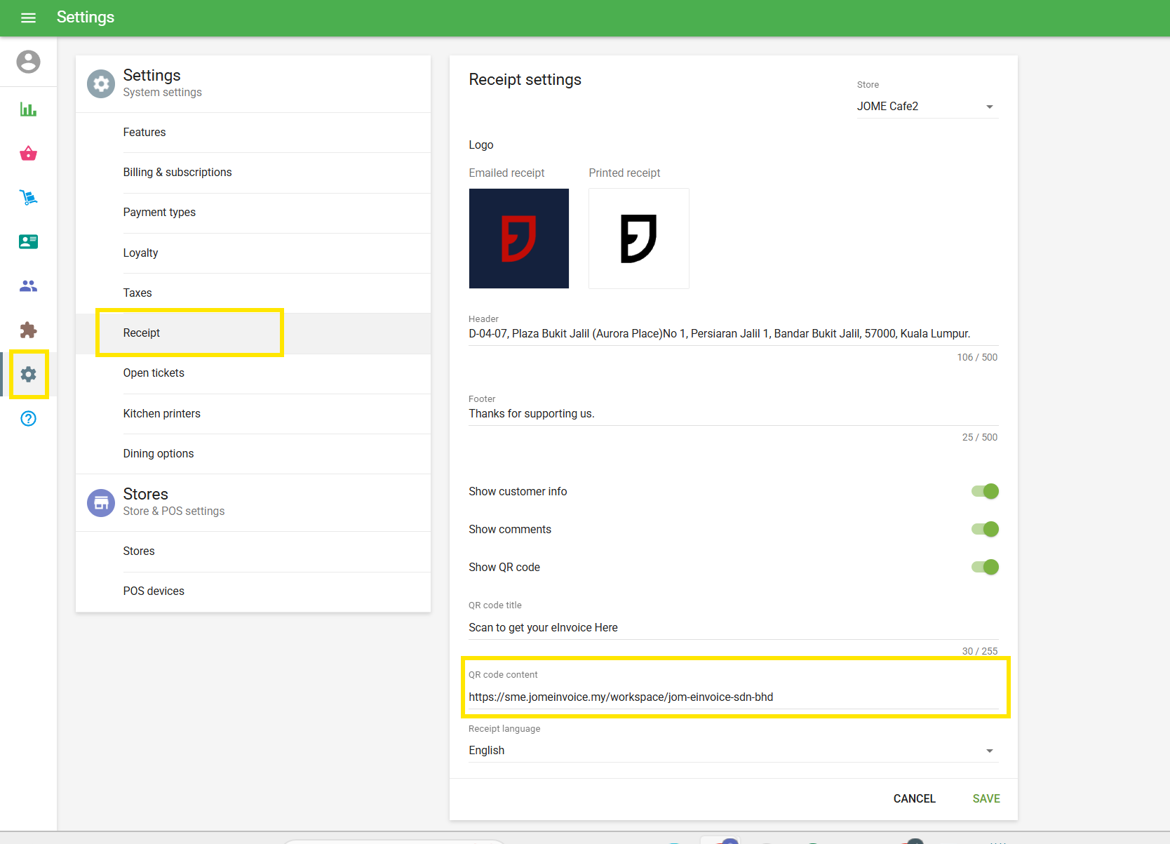 Go to Settings > Receipt > and add your Jome workspace URL in the QR code content > then click save